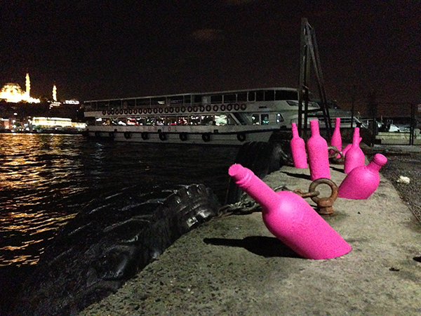 Street installation with pink bottles at The Golden Horn, Istanbul. See more pictures here.